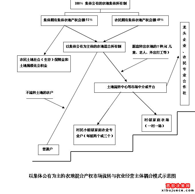 李錄堂向《西部大開發(fā)》介紹,董家?guī)X村示范項(xiàng)目探索建立“以土地集體公有為主,非集體(農(nóng)民)土地所有為輔”的土地集體公有制,通過(guò)土地承包經(jīng)營(yíng)控制權(quán)比例化市場(chǎng)流轉(zhuǎn)試驗(yàn),組建土地股份合作社、家庭農(nóng)場(chǎng)和專業(yè)大戶等經(jīng)營(yíng)主體,實(shí)行規(guī)模化集約化經(jīng)營(yíng),進(jìn)而科學(xué)地解決人多地少條件下土地產(chǎn)權(quán)市場(chǎng)化可能產(chǎn)生的社會(huì)不穩(wěn)定因素以及農(nóng)民農(nóng)地產(chǎn)權(quán)自由進(jìn)入和退出問(wèn)題,讓農(nóng)民“退出土地”有保障,“進(jìn)入土地”有支持,徹底消除農(nóng)民流轉(zhuǎn)土地的后顧之憂,形成“以公有制為主體具有雙重保障的農(nóng)地市場(chǎng)流轉(zhuǎn)機(jī)制”。這一農(nóng)村土地改革的新思路是遵照“以公有制為主體,多種所有制經(jīng)濟(jì)成分并存”的《憲法》原則,借鑒國(guó)有企業(yè)劃分國(guó)有股、企業(yè)股和企業(yè)全員持股的經(jīng)驗(yàn)及城鎮(zhèn)住房公積金改革的做法,將農(nóng)地產(chǎn)權(quán)(農(nóng)地承包經(jīng)營(yíng)使用權(quán)等)在集體和農(nóng)民之間按集體占51%,農(nóng)民占49%的比例混合分配后再市場(chǎng)化流轉(zhuǎn)。其中集體所占農(nóng)地產(chǎn)權(quán)及收益總額的51%主要用于農(nóng)民土地社會(huì)保障金和農(nóng)地規(guī)?;e金,以解決農(nóng)地市場(chǎng)流轉(zhuǎn)過(guò)程中失地失業(yè)農(nóng)民的生存和就業(yè)保障問(wèn)題,其余49%的收益歸農(nóng)民個(gè)人所有,進(jìn)而形成既能保證農(nóng)地集體所有制主導(dǎo)地位,又具有雙重保障和穩(wěn)定性的農(nóng)地產(chǎn)權(quán)市場(chǎng)流轉(zhuǎn)機(jī)制。