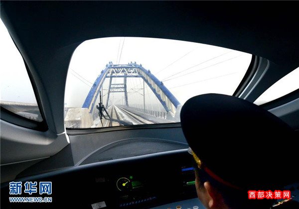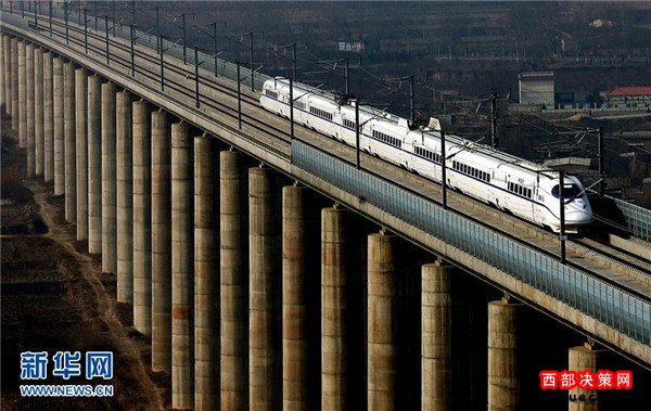 一列試運(yùn)行的動(dòng)車(chē)組列車(chē)從鄭西高鐵三門(mén)峽附近的一座特大型橋梁上駛過(guò)(2010年1月16日攝)。