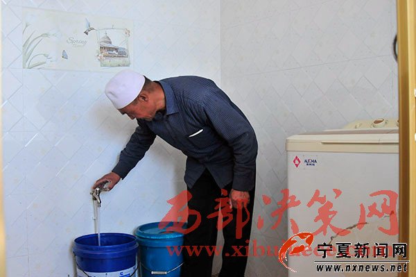 在海原水務(wù)局曹洼水利工作站站長(zhǎng)牛志遠(yuǎn)的帶領(lǐng)下,我們來到了白崖村村民馬正海的家。這是個(gè)干凈整潔的院落,兩間并排的磚瓦房,步入屋內(nèi),馬正海正在教老伴如何使用洗衣機(jī)。“50多歲了第一次用洗衣機(jī),還不會(huì)操作呢” ,馬正海的老伴笑著說,“今年4月家里通上自來水,前陣子就去買了臺(tái)洗衣機(jī),這在之前想都不敢想。”