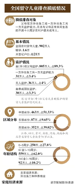 在昨日召開(kāi)的農(nóng)村留守兒童關(guān)愛(ài)保護(hù)工作部際聯(lián)席會(huì)議上,民政部副部長(zhǎng)高曉兵透露了此次摸底排查的結(jié)果。據(jù)她介紹,此次摸底排查開(kāi)始于今年3月底,排查結(jié)果顯示,全國(guó)農(nóng)村留守兒童902萬(wàn)人。