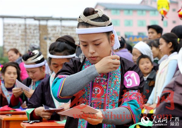 11月12日,在三江侗族自治縣多耶廣場,侗鄉(xiāng)繡娘在進(jìn)行刺繡比賽。