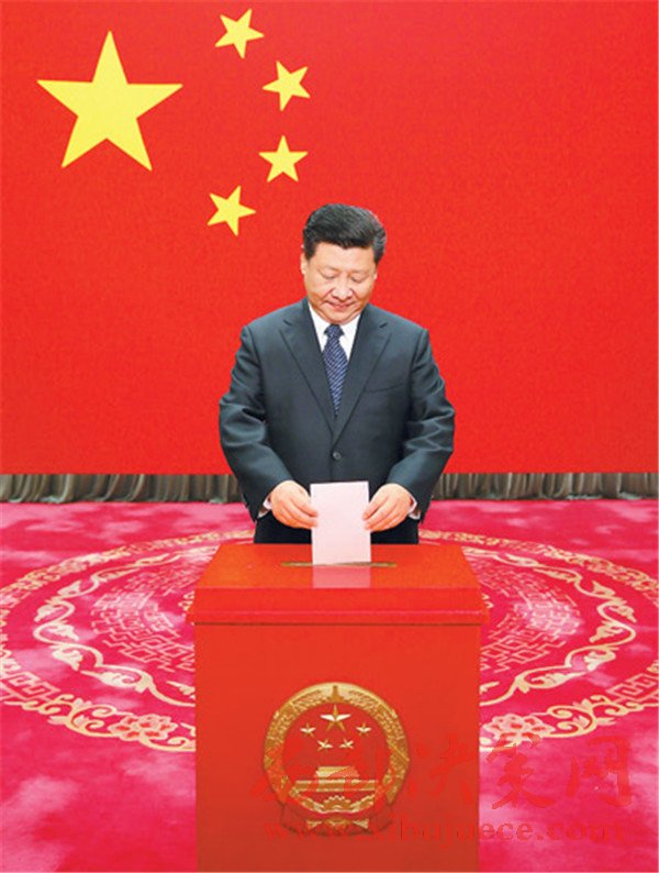 上午10時(shí)許,習(xí)近平來(lái)到懷仁堂投票站,同投票站的工作人員親切握手,仔細(xì)聽取有關(guān)選舉事項(xiàng)的說(shuō)明。習(xí)近平拿出選民證交給工作人員核驗(yàn),并領(lǐng)取了一張選票。在寫票處認(rèn)真填寫選票后,習(xí)近平走到票箱前鄭重投下自己的一票。