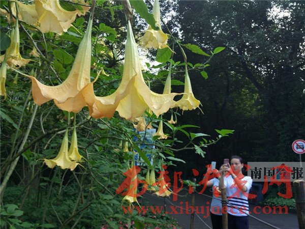 “南瓜花不是長(zhǎng)在藤蔓上的嗎,怎么這些‘南瓜花’都倒吊著長(zhǎng)在了樹(shù)枝上?”昨日,柳州市龍?zhí)豆珗@里的不少游客,都被路旁一種奇異的開(kāi)花樹(shù)木所吸引,紛紛駐足觀賞拍照。記者了解到,那是公園新近引種的木本曼陀羅,因?yàn)閷儆谟卸局参?,市民前往觀賞時(shí),最好眼看手勿動(dòng)。