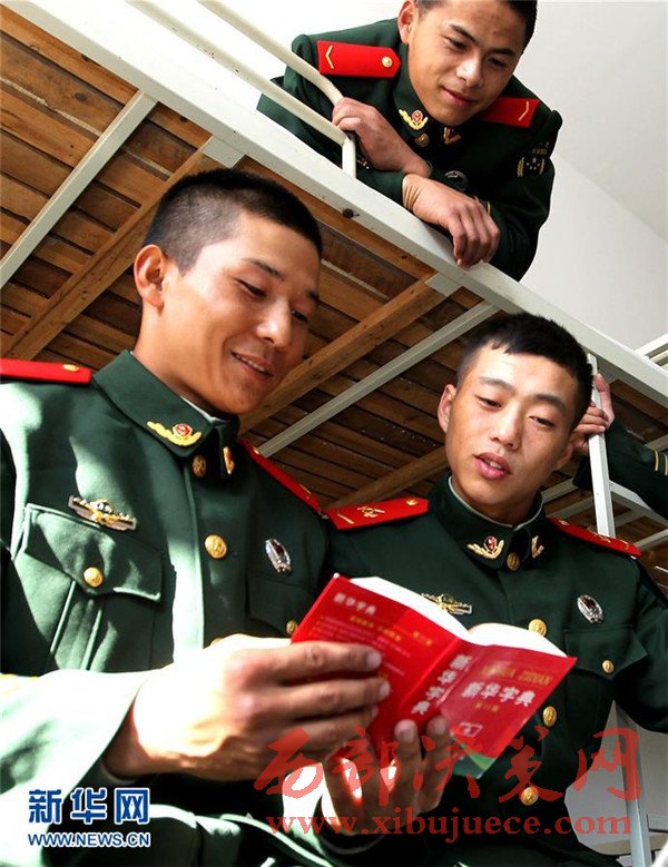12月5日,艾麥爾·吾斯曼(左一)在連隊戰(zhàn)友的幫助下學(xué)習(xí)漢語。