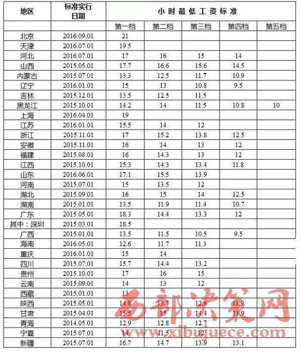 同一天,人社部勞動關(guān)系司公布的《全國各地區(qū)小時最低工資標(biāo)準(zhǔn)情況》則顯示,小時最低工資標(biāo)準(zhǔn)中,北京最高,為21元,其次是天津,為19.5元。
