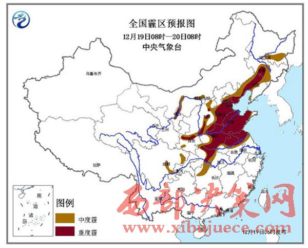 中央氣象臺預(yù)計,19日08時至20日08時,北京中南部、天津、河北中南部、山西中南部、山東大部、河南大部、陜西關(guān)中、湖北西部、蘇皖北部、遼寧中西部、吉林中部等地有中度霾,其中,北京南部、天津、河北中南部、河南中北部、山東大部、山西南部、陜西關(guān)中、湖北西部、蘇皖北部、遼寧中部、吉林中部等地的部分地區(qū)有重度霾,最低能見度為1公里左右。中央氣象臺12月19日06時繼續(xù)發(fā)布霾橙色預(yù)警。