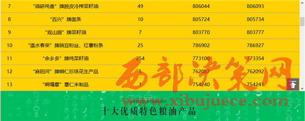 余慶縣大涼山米業(yè)有限責(zé)任公司的“大涼山”香米,貴州赫章縣黔豐蕎業(yè)有限公司的“黔豐”牌苦蕎系列產(chǎn)品,印江土家族苗族自治縣騰飛米業(yè)有限責(zé)任公司的“大圣墩”牌大米,貴州油研純香生態(tài)糧油科技有限公司的“油研純香”牌脫皮冷榨菜籽油,納雍縣百興鎮(zhèn)白泥屯特色產(chǎn)品有限公司的“百興”牌面條,貴州省貴定縣古鎮(zhèn)香糧油有限公司的“觀山園”牌菜籽油,習(xí)水縣春榮食品加工廠的“溫水春榮”牌豌豆粉絲、紅薯粉條七個(gè)產(chǎn)品也憑借優(yōu)異的表現(xiàn)躋身前十。遵義地區(qū)糧油產(chǎn)品占據(jù)前十名三個(gè)席位,黔南、畢節(jié)、銅仁各有兩個(gè)糧油產(chǎn)品躋身前十,六盤(pán)水一個(gè)產(chǎn)品入圍十強(qiáng)。