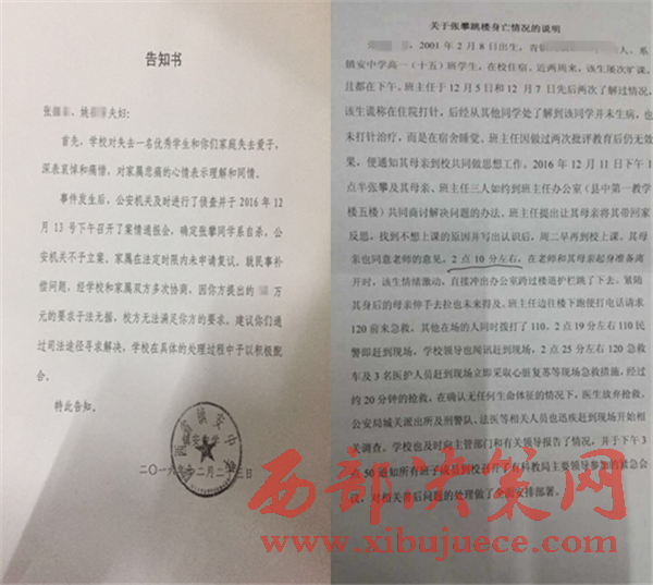 據(jù)墜樓學(xué)生張某母親姚女士悲傷地說(shuō):“我兒子于2016年中考以優(yōu)秀的成績(jī)考入高中分在高一(15)班,他從小聽(tīng)話、好學(xué),在小學(xué)、初中名列前茅,因此在高中表現(xiàn)突出,出任班長(zhǎng)、團(tuán)支部書(shū)記,在校期間學(xué)習(xí)認(rèn)真;在入學(xué)期間中考進(jìn)步明顯由700多名進(jìn)步到305名。自8月20日高中新學(xué)年開(kāi)學(xué)以來(lái),鎮(zhèn)安縣高中長(zhǎng)時(shí)間利用節(jié)假日補(bǔ)課,我兒子連續(xù)四周沒(méi)回家,由于天氣變化感冒,曾向老師請(qǐng)假打針,可因?yàn)殄X(qián)不夠、沒(méi)時(shí)間回家取,白天上完課體力不支、趁晚自習(xí)在宿舍休息、連續(xù)幾天如此;老師沒(méi)向家長(zhǎng)反映,也沒(méi)了解孩子的身體狀況。于2016年12月11日早我接到班主任(祁某虎)電話,讓我到學(xué)校談話、我下午一點(diǎn)左右到鎮(zhèn)安縣中;由我兒子帶到班主任辦公室,路途中我兒子還再三叮囑我、讓我給班主任說(shuō)好話;在班主任辦公室祁某虎說(shuō)了我兒子的情況;①?gòu)埬惩瑢W(xué)由中考七百多名進(jìn)步到三百零五名,學(xué)習(xí)成績(jī)進(jìn)步明顯;②在班上表現(xiàn)突出,出任班長(zhǎng)、團(tuán)支部書(shū)記,是一個(gè)好學(xué)生;③在本周連續(xù)曠課,需回家反省、停課三天。我讓兒子給班主任當(dāng)面講清為什么曠課,班主任堅(jiān)持的說(shuō):‘我不想知道原因,因?yàn)槟愫逦因_我,你態(tài)度惡劣必須嚴(yán)肅處理,不然在班上難以服眾、無(wú)法管理其他學(xué)生;必須回家停課、反省、寫(xiě)保證書(shū),一份給父母、一份給老師、一份自己留著并在全班讀,要夾在書(shū)里天天看’;孩子不想回家要上學(xué),不想停課誤了學(xué)業(yè)懇求道:‘我在學(xué)校寫(xiě)保證書(shū),一定會(huì)端正態(tài)度’。孩子再三請(qǐng)求無(wú)果,我也懇求留下孩子,可是班主任始終態(tài)度堅(jiān)決,并起身說(shuō):‘你不走、我走,不回家反省、不用來(lái)上學(xué)’。我兒子攔住班主任準(zhǔn)備下跪請(qǐng)求,班主任訓(xùn)斥道:‘張某、你想咋地’,我兒子說(shuō):‘老師你錯(cuò)了’,可是班主任依然堅(jiān)持;然后我兒子走投無(wú)路用無(wú)助的目光環(huán)視了我一下,轉(zhuǎn)身就沖出去從五樓跳下;事發(fā)后班主任依然無(wú)動(dòng)于衷,也沒(méi)有及時(shí)報(bào)警;當(dāng)時(shí)一高三學(xué)生說(shuō):‘趕快報(bào)警’,一老師說(shuō):‘這沒(méi)你的事趕快回教室’。事后學(xué)校第一次與親屬談話;城關(guān)派出所通報(bào)了案情,班主任祁某虎講述了事情經(jīng)過(guò)說(shuō)他讓我兒子回家反省,是他的一貫教學(xué)手段;他作為班長(zhǎng)行為惡劣,不拿他作為教育榜樣,無(wú)法教育好其他學(xué)生,有起殺一儆百的作用。第二次談話說(shuō),家屬要求給一個(gè)交代、追究相關(guān)人責(zé)任,學(xué)校最后表面管的稱;①不怕家屬上訪、②不怕借助媒體報(bào)道討說(shuō)法、③不怕經(jīng)過(guò)司法來(lái)告狀。在此期間我們找過(guò)主管教育的朱縣長(zhǎng)稟明此事,朱縣長(zhǎng)表示沒(méi)有接到真實(shí)上報(bào),對(duì)事情不了解,他會(huì)嚴(yán)肅處理、并電話責(zé)令龍校長(zhǎng)嚴(yán)格對(duì)待處理此事??墒鞘嗵爝^(guò)去,學(xué)校依然沒(méi)有任何處理,態(tài)度強(qiáng)硬、用各種手段施壓;至25日14時(shí),學(xué)校給我們親屬安排在鎮(zhèn)安縣開(kāi)元酒店的房子,也責(zé)令酒店收回將我們都趕出來(lái)了,在這雪雨交加的天氣我們?cè)摵稳ズ螐?,孩子的遺體還在殯儀館我們?cè)撛趺崔k”。