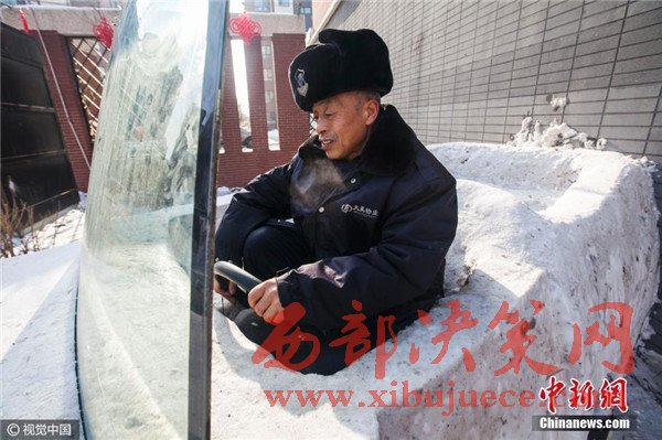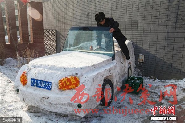 1月3日,吉林省長春市,六旬保安組團建雪雕汽車,上車下車用啤酒箱當踏板。