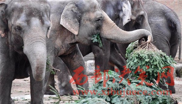當(dāng)?shù)貢r間2017年1月3日,德國柏林,Zoologischer Garten動物園的大象們食用“圣誕樹”美食大餐。