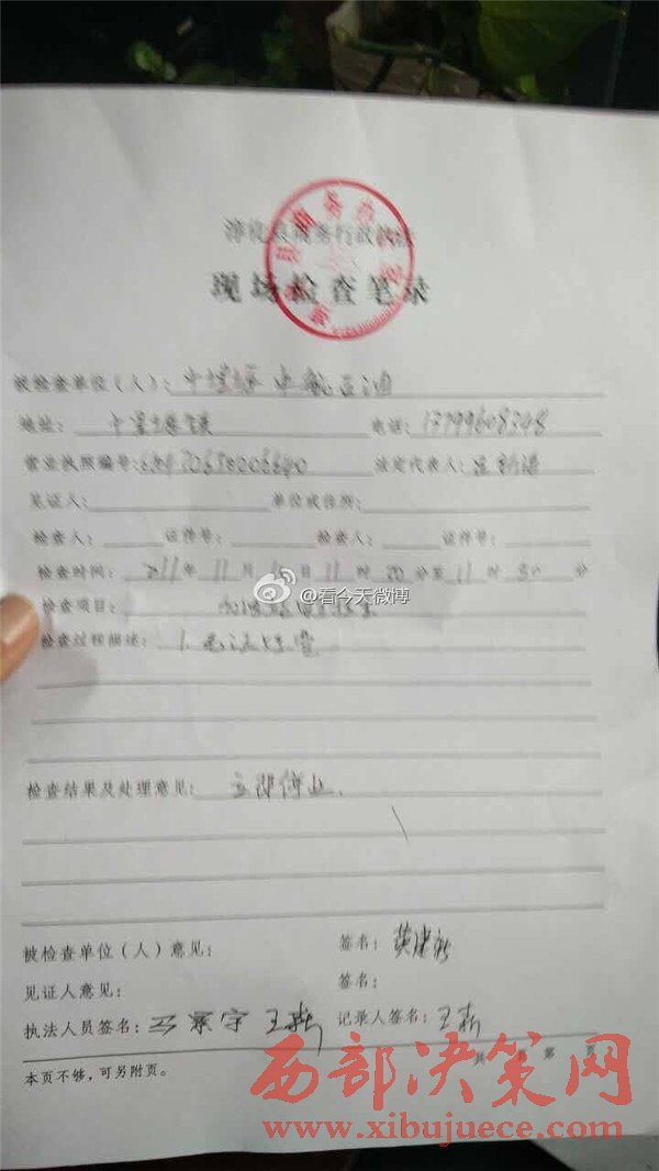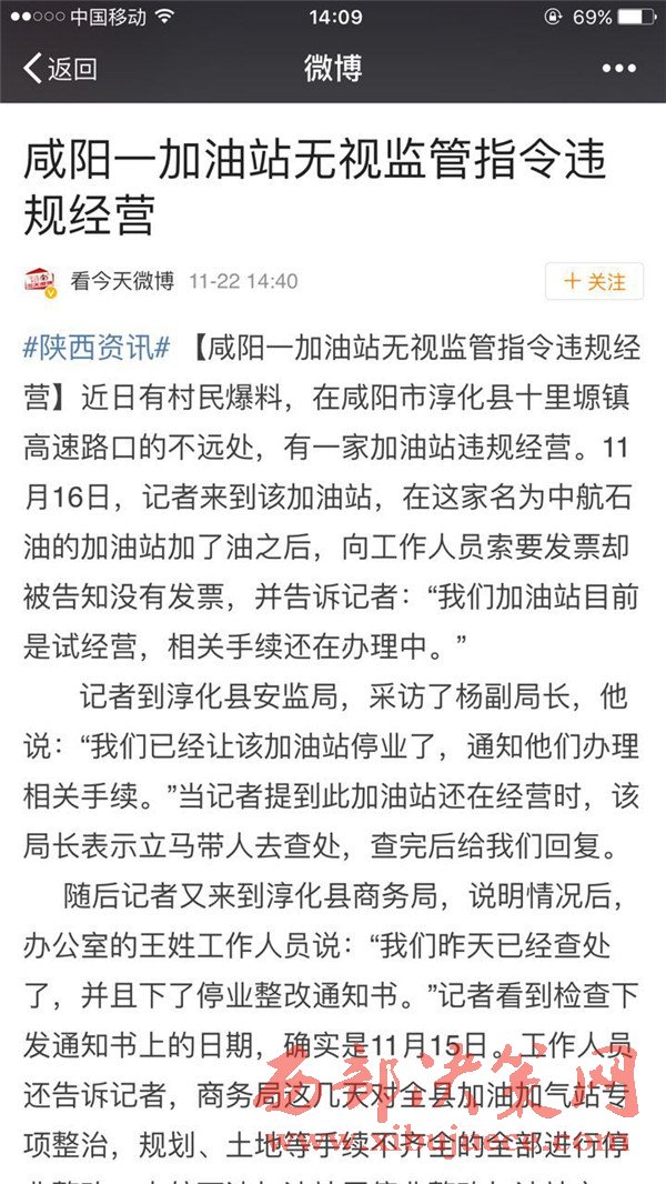 記者到淳化縣安監(jiān)局,采訪了楊副局長(zhǎng),他說:“我們已經(jīng)讓該加油站停業(yè)了,通知他們辦理相關(guān)手續(xù)。”當(dāng)記者提到此加油站還在經(jīng)營(yíng)時(shí),該局長(zhǎng)表示立馬帶人去查處,查完后給我們回復(fù)。隨后記者又來到淳化縣商務(wù)局,說明情況后,辦公室的王姓工作人員說:“我們昨天已經(jīng)查處了,并且下了停業(yè)整改通知書。”記者看到檢查下發(fā)通知書上的日期,確實(shí)是11月15日。