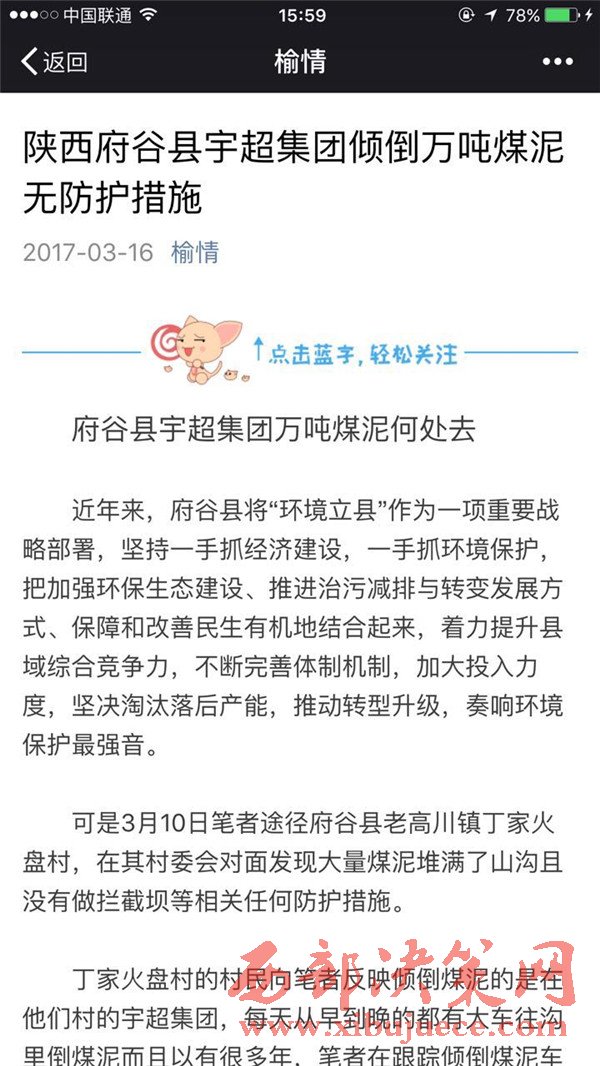 丁家火盤村的村民向筆者反映傾倒煤泥的是在他們村的宇超集團(tuán),每天從早到晚的都有大車往溝里倒煤泥而且以有很多年,筆者在跟蹤傾倒煤泥車證實(shí)了村民的說(shuō)法,筆者通過(guò)撥打12369環(huán)保熱線將此事反映給了府谷縣環(huán)保局,環(huán)保局的同志說(shuō)會(huì)立即調(diào)查并向筆者反饋調(diào)查結(jié)果。