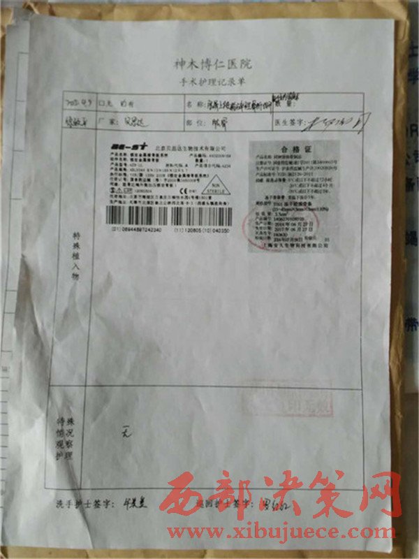 患者家屬將原來在博仁醫(yī)院住院的資料全部拿出來時(shí)發(fā)現(xiàn),大保當(dāng)博仁醫(yī)院當(dāng)時(shí)給患者做手術(shù)所用的鋼板可能存在問題,做手術(shù)所用的鋼板與當(dāng)時(shí)給患者提供的合格證書不符,在此期間家屬也找過原博仁醫(yī)院劉院長,所給的答復(fù)是他剛來不知道此事,董事長(賀玉剛)也說是在西安,你們先看病,回頭把鋼板拿過來,等鋼板廠家的人來了,我們?nèi)阶谝黄鹂丛趺唇鉀Q,就這樣一直拖著直到現(xiàn)在。