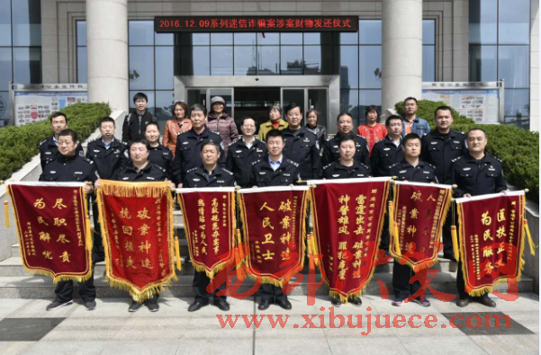 當日,陳倉公安分局現(xiàn)場向來自甘肅省會寧縣的受害群眾宋某芳和來自寶雞市千陽縣的受害群眾邢某俠等7名群眾共計發(fā)放被騙贓款170000余元。當宋某芳等7名群眾從該局局長楊會軍和政委苗寶平手中領(lǐng)到被騙的現(xiàn)金時喜極而泣,不時的連聲說“感謝公安局、感謝公安民警、真是謝謝啦”,有的群眾面向公安民警和媒體記者深深鞠躬表達謝意,并將七面繡著“人民衛(wèi)士、破案神速,為民服務(wù)、匡扶正義”等內(nèi)容的大紅錦旗增送到民警手中,表達心中的謝意。受害群眾被騙的款數(shù)從數(shù)千元到數(shù)萬元不等,最高達50000余元。
