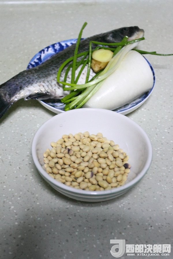 鯽魚1條、白蘿卜半個、黃豆半杯、香蔥3根、生姜1小塊、油適量、鹽適量、清水適量。
