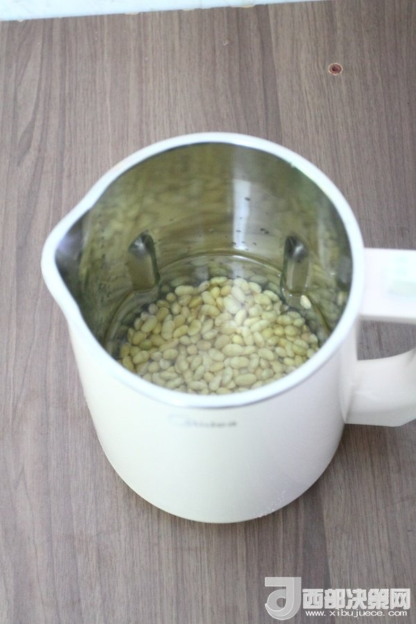 2、將浸泡過后的黃豆撈出放進豆?jié){機桶中,加入適量的水(以最低水位為準(zhǔn))。