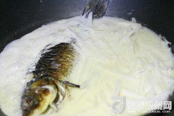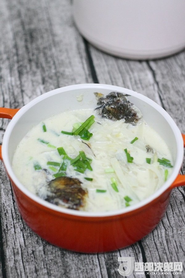 10、加入白蘿卜絲繼續(xù)中小火慢慢燉至湯汁變得更加濃稠和奶白狀態(tài)時出鍋,出鍋前5分鐘左右加入適量鹽調(diào)味,出鍋后撒上蔥花。