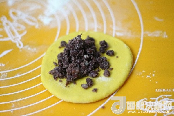5、取其中一個面團搟成小圓形,放入適量蜜豆。