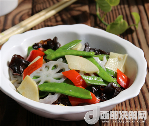 1.蓮藕去皮切片泡入清水中,黑木耳,荷蘭豆摘洗干凈,冬筍片準(zhǔn)備,紅椒切片。