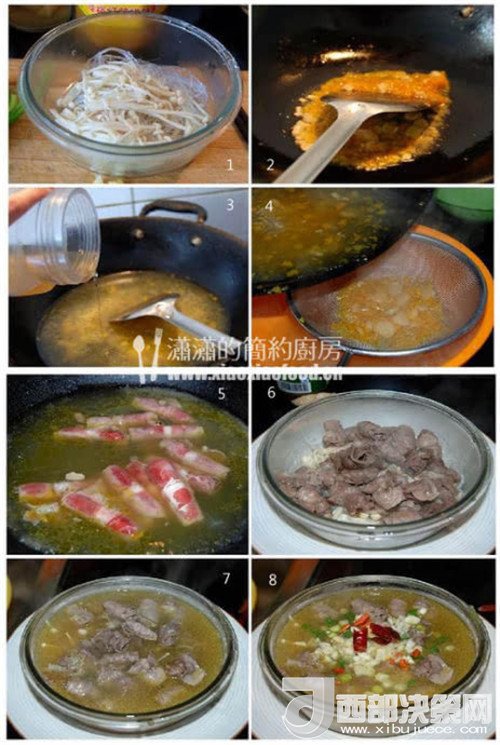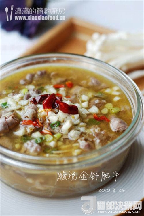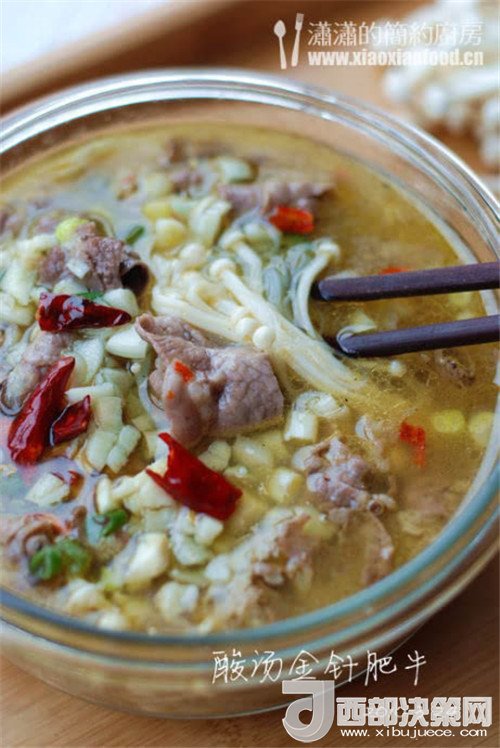 我在網(wǎng)上查了查,酸湯金針肥牛的做法有很多種,但我喜歡的這種突出金湯的特點(diǎn):湯清澈而呈金黃色,酸得爽口利落,留在舌尖的感覺沒有一般肉菜帶來的滯膩感,倒是有一種清爽的回味。
