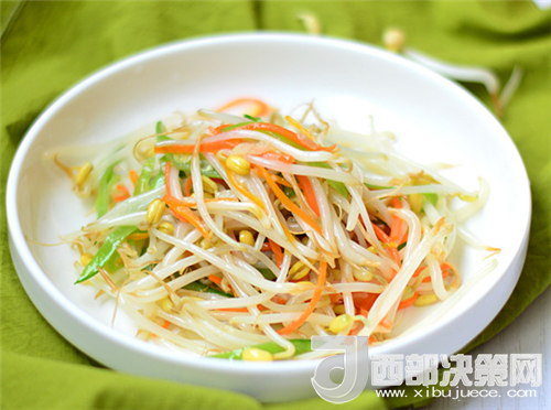 綠豆制豆芽100克、胡蘿卜炒豆芽3/1個、水制豆芽適量、荷蘭豆炒豆芽20克、蒜炒豆芽3瓣。