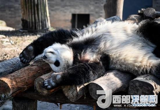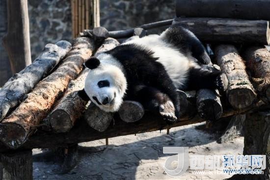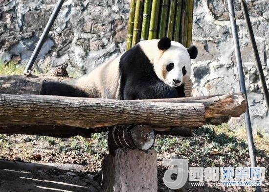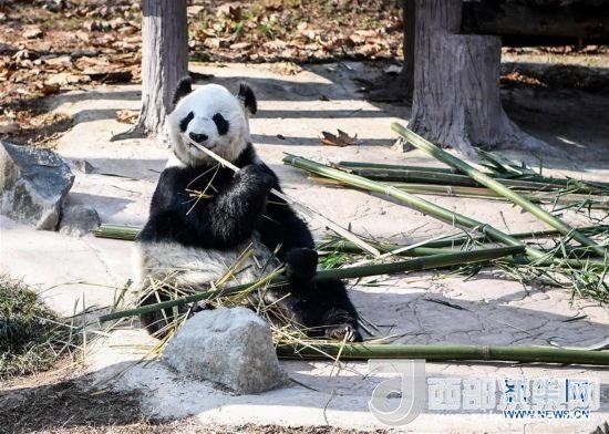大熊貓盡享冬日暖陽品嘗新鮮的竹子