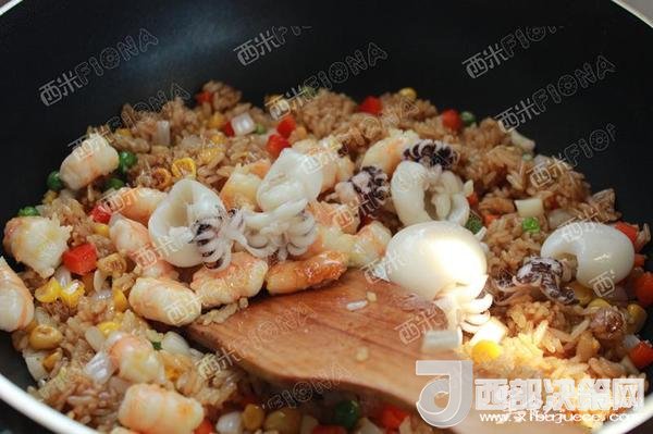 加料也很關(guān)鍵。蔬菜的話,盡量選擇含水份少的。我用的洋蔥,玉米青豆胡蘿卜丁,以及彩椒,既在顏色上有個搭配,營養(yǎng)也豐富。正好冰箱里有蝦和墨魚仔,因此,就把一碗剩米飯炒成了豪華海鮮飯了。如果家里有XO醬的,加進去,更加美妙。
