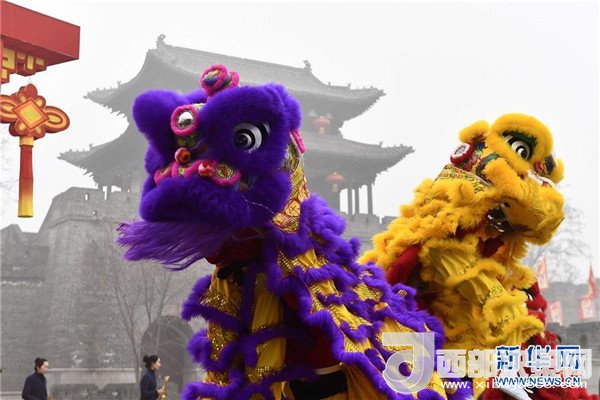 1月1日,在臺(tái)兒莊古城開(kāi)福門儀式上,民間藝人在表演舞獅。(記者 郭緒雷 攝)