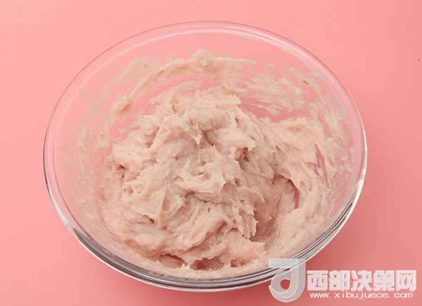 4、準(zhǔn)備一鍋冷水開始擠魚丸,拇指先在虎口處滑一下,把魚茸磨平,這樣擠出來的魚丸就會(huì)光滑。然后往上擠,用另一只手拿勺子接一下魚丸。