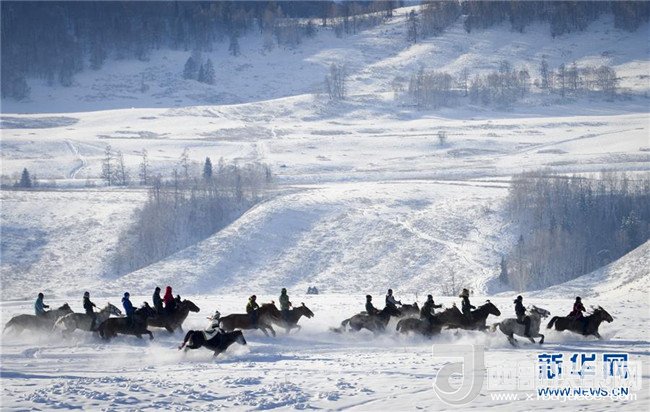 在新疆喀納斯禾木村舉辦的潑雪節(jié)上,當?shù)鼐用裨跒橛慰捅硌菅┑氐鹧颍?月1日攝)。記者 趙戈 攝