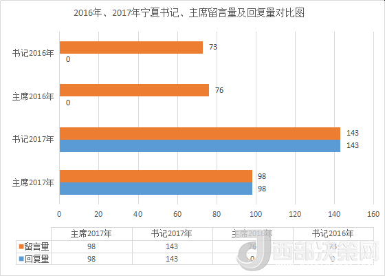 據(jù)統(tǒng)計(jì),2017年,人民網(wǎng)網(wǎng)友分別給寧夏黨委書記、政府主席公開留言143條和98條,同期增長(zhǎng)幅度較大,其中書記留言量增長(zhǎng)49%。值得點(diǎn)贊的是,書記、主席全年的回復(fù)率達(dá)100%,各項(xiàng)數(shù)據(jù)均創(chuàng)新高。