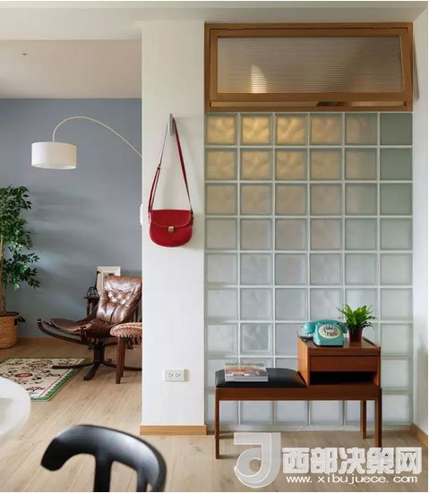 客廳的前方是隔開(kāi)的陽(yáng)臺(tái),背面則是衛(wèi)浴室,一處墻面用玻璃磚代替,增加了衛(wèi)浴室的采光,和白色墻面比起來(lái)更顯通透。