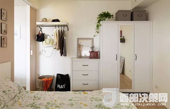 藤筐、收納箱、掛衣桿、衣柜,各種收納工具一應(yīng)俱全,搭配得十分得宜。衣柜中間柜門(mén)上安裝了全身鏡。對(duì)于不愿把鏡子放進(jìn)臥室的房友們來(lái)說(shuō),不知道這樣子布置會(huì)不會(huì)稍好一些。