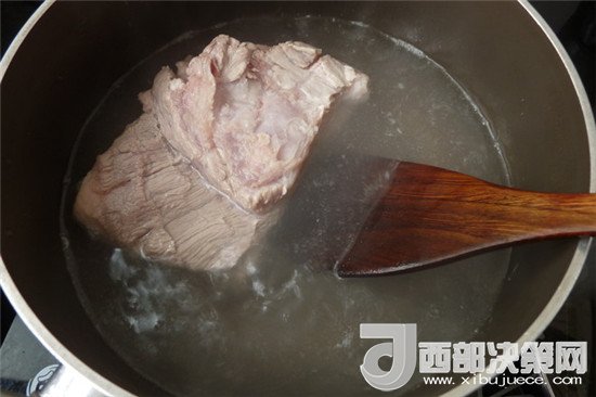 3.鍋內(nèi)不放油燒熱,把肉切塊后放入