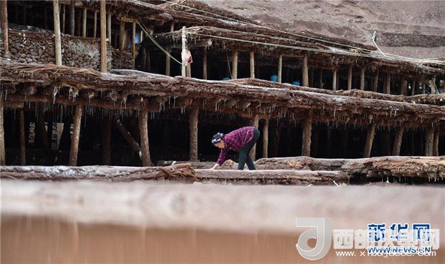 鹽農(nóng)在整理鹽田鹵水滲下形成的鹽柱(3月11日攝)。