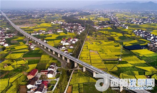 3月21日,一列動(dòng)車正通過(guò)陜西省漢中市南鄭縣新集鎮(zhèn)油菜花海(無(wú)人機(jī)拍攝)。新華社記者 陶明 攝