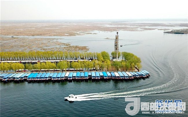 一艘游船在白洋淀景區(qū)旅游碼頭內(nèi)行駛(3月30日無人機(jī)拍攝)。新華社記者 牟宇 攝