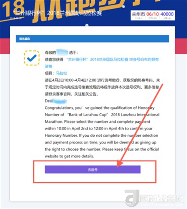 西部決策網(wǎng)—西部大開發(fā)訊(杜杰 帥華鋒)“蘭州銀行杯”2018蘭州國際馬拉松賽預(yù)報(bào)名工作已于3月25日15:00截止,現(xiàn)已全面進(jìn)入資質(zhì)審核階段,在所有成功預(yù)報(bào)名的選手中,終身號(hào)碼(含歷屆與2018新進(jìn))擁有者可于4月3日10:00-4月5日12:00通過官網(wǎng)完成自主選號(hào)并繳費(fèi);馬拉松項(xiàng)目直通選手(不含組委會(huì)特邀及專業(yè)運(yùn)動(dòng)員,詳見官網(wǎng)報(bào)名須知)也可于4月6日10:00-4月8日12:00完成自主選號(hào)并繳費(fèi)。具體規(guī)則及流程如下: