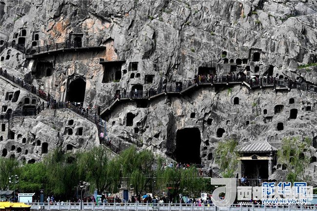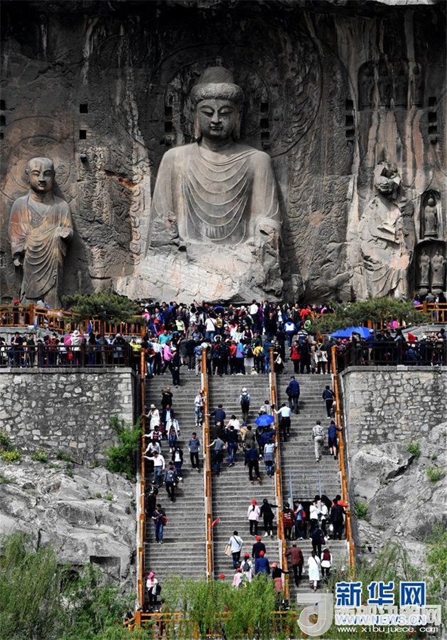 4月11日,游客在河南洛陽龍門石窟景區(qū)參觀游覽。