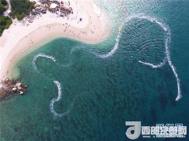 在三亞蜈支洲島參加2016動(dòng)力沖浪板國(guó)際賽中國(guó)站的選手在比賽中(2016年9月18日無人機(jī)拍攝)。新華社記者 楊冠宇 攝