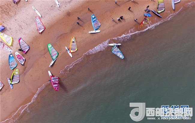參加2017第四屆國(guó)際旅游島帆板大獎(jiǎng)賽海口大獎(jiǎng)賽的選手在比賽結(jié)束后上岸(2017年11月16日無人機(jī)拍攝)。新華社記者 楊冠宇 攝