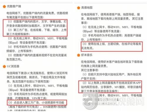 以優(yōu)酷和中國電信合作的“大小魚卡”為例,其說明顯示,“優(yōu)酷視頻專屬流量不包括優(yōu)酷客戶端內(nèi)圖片、文字、彈幕加載、打開優(yōu)酷視頻時(shí)加載圖片、文字等產(chǎn)生的流量。”當(dāng)然,第三方廣告也不在內(nèi)。