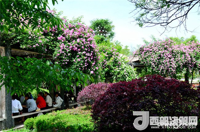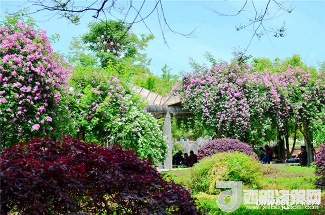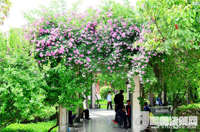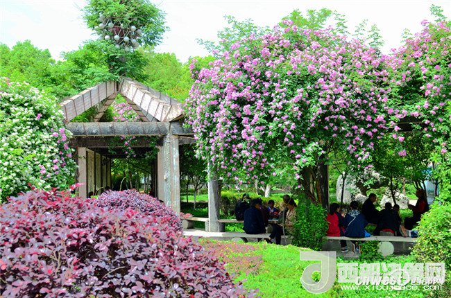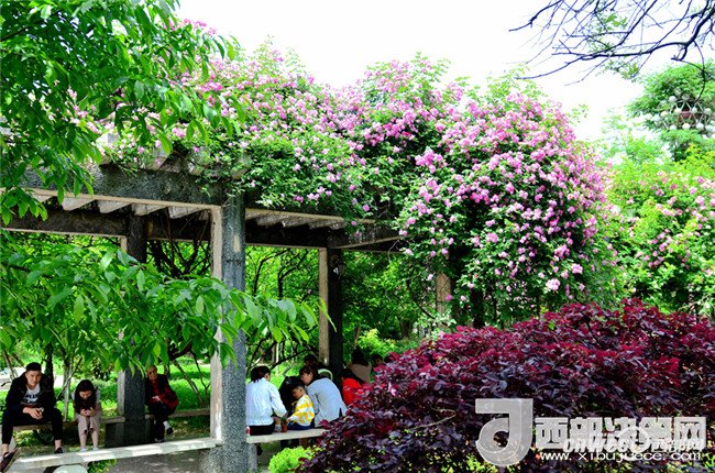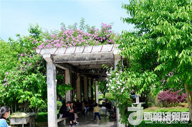 5月1日,市民正在寧強縣縣城三角洲公園里的薔薇花下納涼賞花。