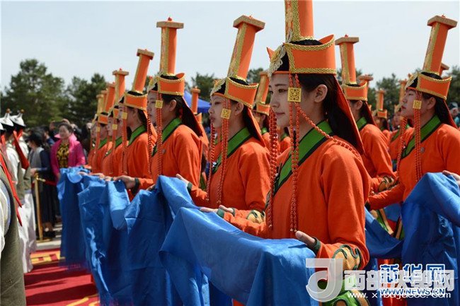 5月6日,在成吉思汗陵,身著盛裝的姑娘手捧哈達進行祭祀活動。新華社記者 鄒予 攝