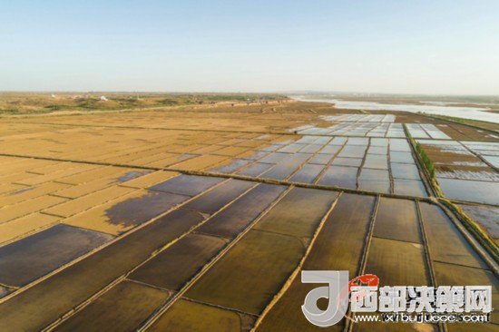 5月6日18時50分許,伴著落日金色的余暉,銀川市賀蘭縣黃河邊剛剛灌水的稻田波光粼粼,銀川平原引黃灌區(qū)稻田灌水,即將進(jìn)入插秧季。 寧夏新聞網(wǎng)記者 祁瀛濤 攝