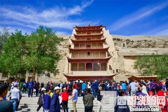 圖為莫高窟九層樓前人潮涌動。 王斌銀 攝