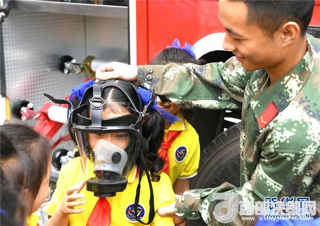 6月2日,一名消防官兵(右)在廣西南寧市青秀區(qū)公安消防大隊柳沙中隊為孩子佩戴消防面罩。