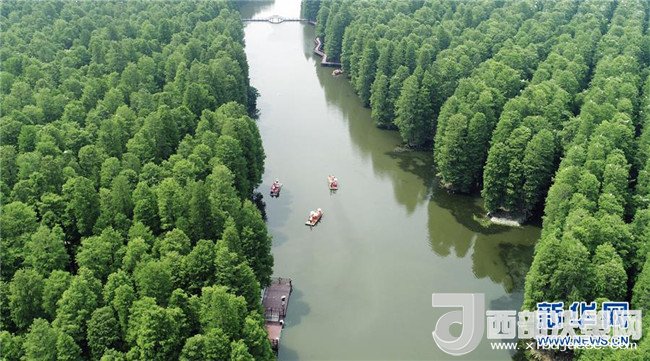 夏日時節(jié),位于江蘇省興化市李中鎮(zhèn)的水上森林公園滿目蒼翠,綠意撲面。水杉、池杉等樹木構成了一幅幅夏日畫卷,吸引不少游客前往游覽。
