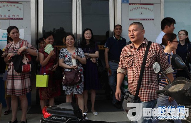 6月7日,在2018年高考成都通錦中學(xué)考點(diǎn),梁實(shí)(前右)吸引考生家長的目光。新華社記者 江宏景攝