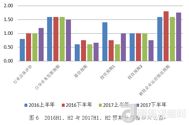 相較于募資、投資、退出指標(biāo)的微降,機(jī)構(gòu)信心指標(biāo)上漲顯示投資人對2018年北京地區(qū)股權(quán)投資發(fā)展充滿了信心。從預(yù)期分項(xiàng)指標(biāo)看,雖然指標(biāo)所處水平顯示投資人認(rèn)為2018年上半年行業(yè)總體仍將保持平穩(wěn)發(fā)展態(tài)勢,對自身業(yè)務(wù)發(fā)展預(yù)期、募資預(yù)期、投資預(yù)期保持中性,但是行業(yè)總體評價(jià)、被投企業(yè)運(yùn)營情況預(yù)期、募資預(yù)期、投資預(yù)期這四個(gè)指標(biāo)均較上期有所增長,而自身業(yè)務(wù)發(fā)展預(yù)期指標(biāo)和投資預(yù)期指標(biāo)較上期有所下降,綜合顯示投資人對行業(yè)和自身業(yè)務(wù)發(fā)展謹(jǐn)慎樂觀的態(tài)度。
